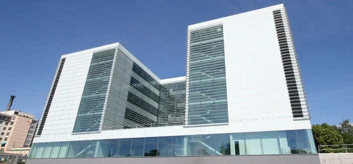 Bolseth Glass har levert glassfasader, glasskledning med emaljert glass og faste solskjermings lameller. Alt fasadeareal er kledd med glass i alum..